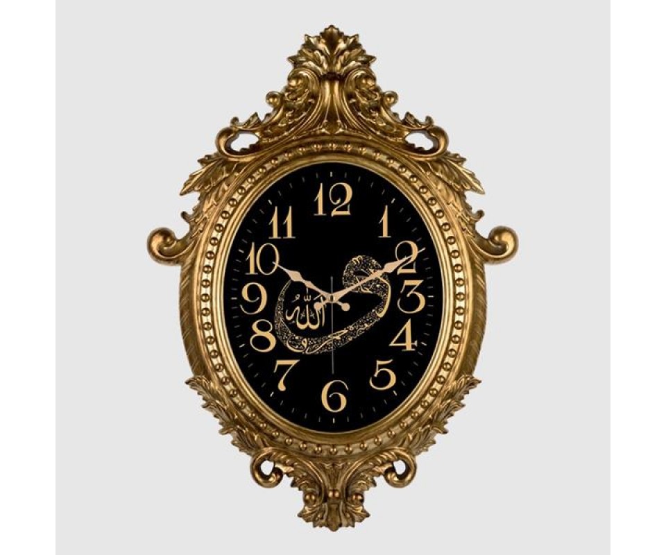 731-VAV DUVAR SAATİ ALTIN SARISI ÇERÇEVE ALLAH /VAV YAZILI ÇAP:73cm x 54cm VİNTAGE TAÇLI EKSİTME DEKORATİF AMERİKAN BRİSTOL KADRAN AKAR SANİYELİ MEKANİZMA AKRİLİK BOYA MİNERAL CAM