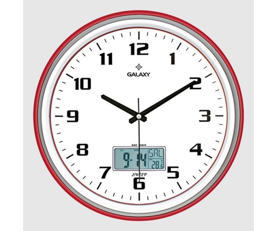 T-1971-NG DUVAR SAATİ KIRMIZI-GRİ ÇİZGİ ÇERÇEVELİ 35.5CM TAKVİMLİ TERMOMETRELİ HİGROMETRELİ ANALOG VE DİJİTAL GÖSTERGELİ AMERİKAN BRİSTOL KADRAN AKAR SANİYELİ MEKANİZ METALİK AKREP/YELOKOVAN/SANİYE