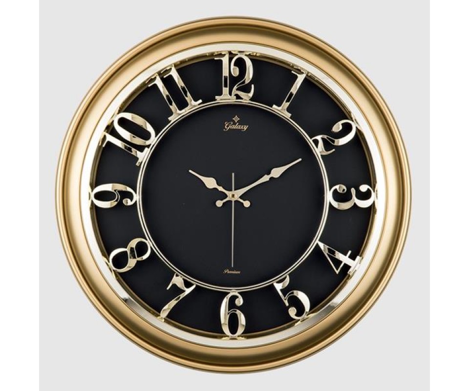 M-1965-A-1 DUVAR SAATİ ALTIN SARISI ÇERÇEVELİ İÇİ SİYAH 45CM KABARTMA RAKAMLI SELEFON KORUMALI AMERİKAN BRİSTOL KADRAN METALİK AKREP/YELKOVAN/SANİYE AKAR SANİYELİ MEKANİZMA AKRİLİK BOYA MİNERAL C