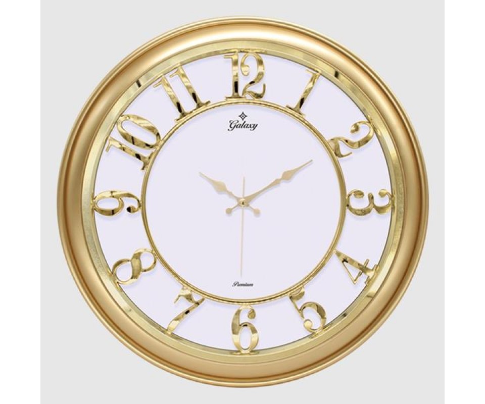 DUVAR SAATİ ALTIN SARISI ÇERÇEVELİ İÇİ BEYAZ 45CM KABARTMA RAKAMLI SELEFON KORUMALI AMERİKAN BRİSTOL KADRAN METALİK AKREP/YELKOVAN/SANİYE AKAR SANİYELİ MEKANİZMA AKRİLİK BOYA ABS HAMMADDE MİNERAL CAM