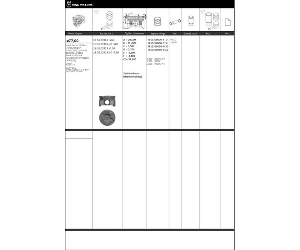 PISTON SEGMAN STD 77.00mm BMW N13 B16 F20 F30 MINI N18 R55 R56 R58 R59 R60 PEUGEOT 5FW EP6 5008 308 3008 207 CITROEN C3 C4